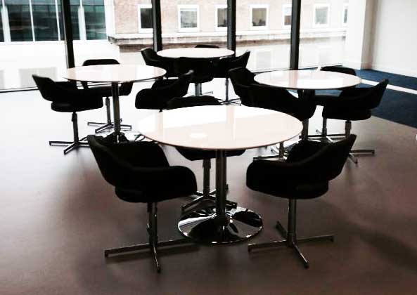 The tables, being a high gloss finish, can be wiped clean with minimum effort. The chairs provided are comfy, but extremely hard wearing, both ideal for Breakout / Café Area.