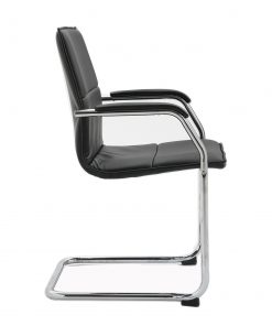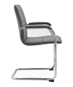 Essen’s chrome cantilever frame and leather faced seat and back offers a sophisticated style with a hint of retro. Available in black and grey with matching padded arms, the smoothly shaped seat and back gently cradle and support the body, providing lateral and lumbar support when in use, and the Essen chairs are fully stackable when idle.