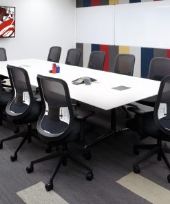 - Black mesh back-rest with white and black frame and black base.