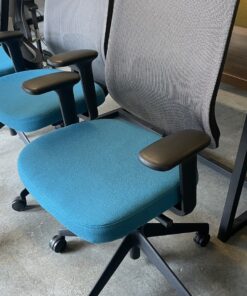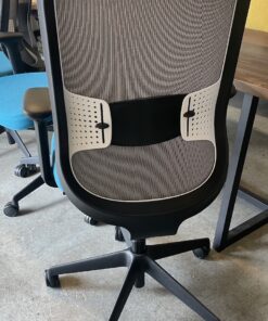 - Blue mesh backrest with white and black frame and black base.