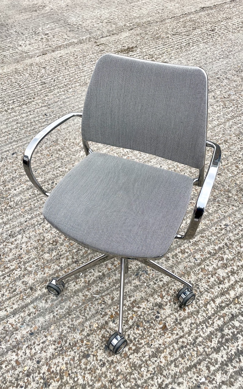 The open frame of the Gas Swivel Chair supports a wide range of materials for the seat and back, and is also available in a choice of three metal finishes.