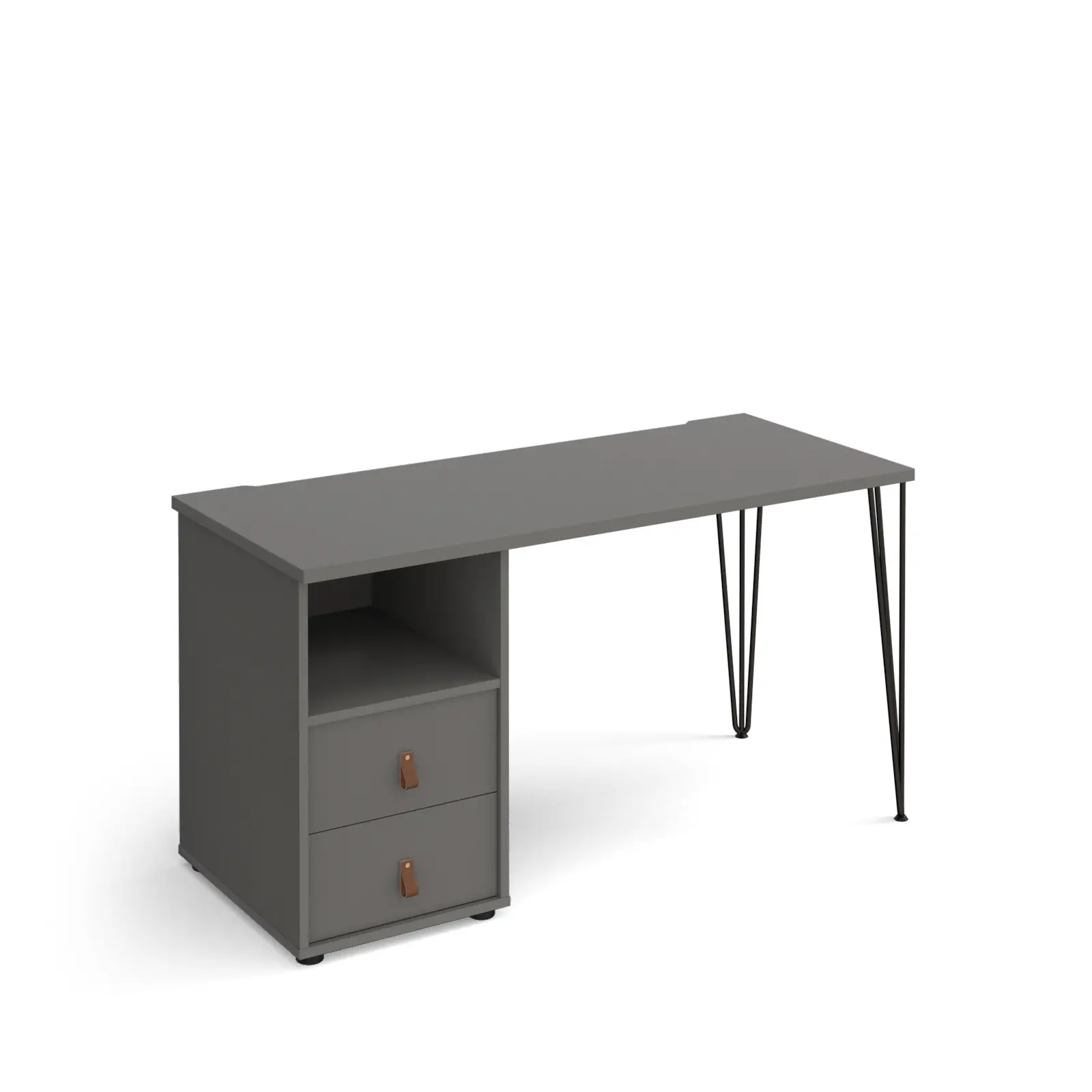 Give your workspace a mid-century modern upgrade with the Tikal workstation with black hairpin legs, which will add both stability and style to any home furniture setting. Available with triple slimline rods, the hairpin legs sit at a reclined angle in each corner of the desktop, complemented by matching hairpin feet for the wooden storage unit and chic shelf brackets to make up the complete home office setup.