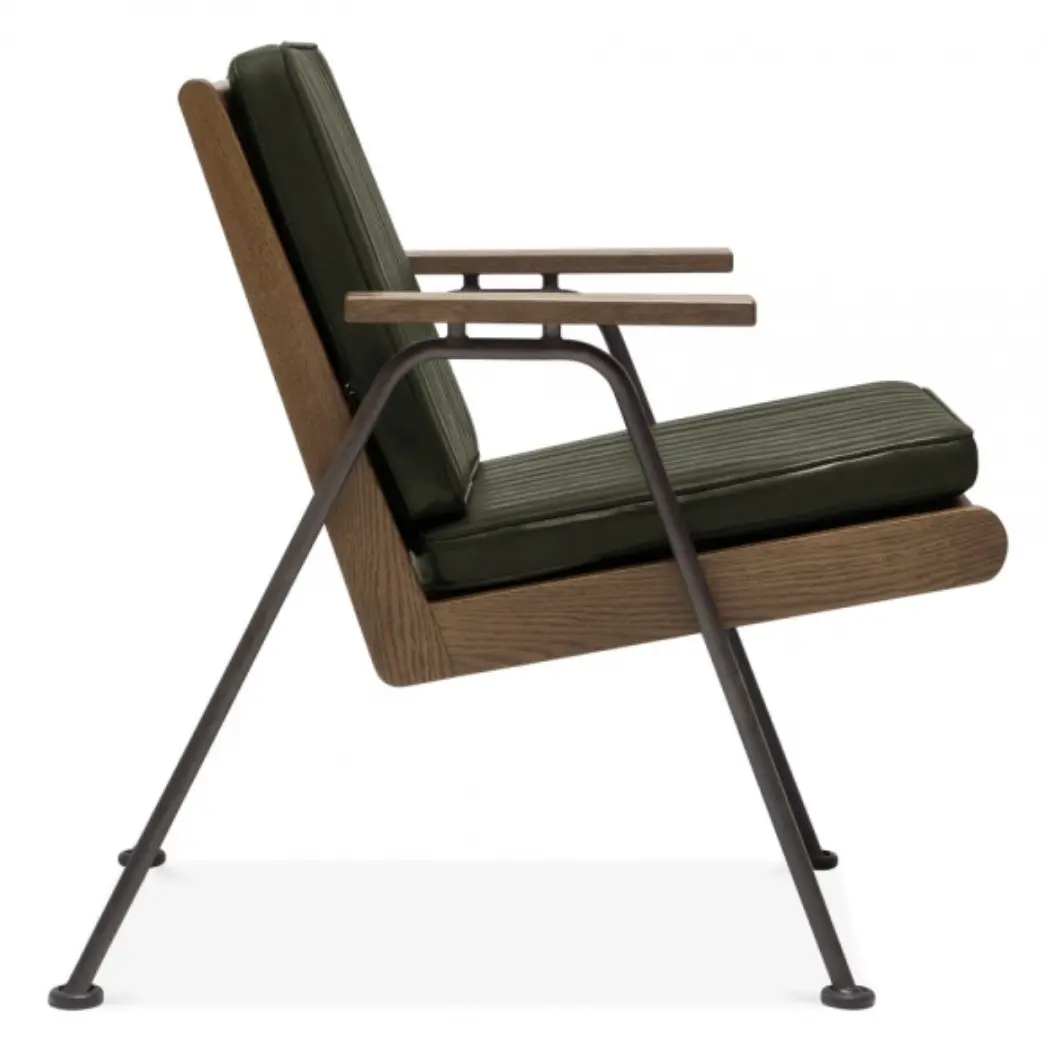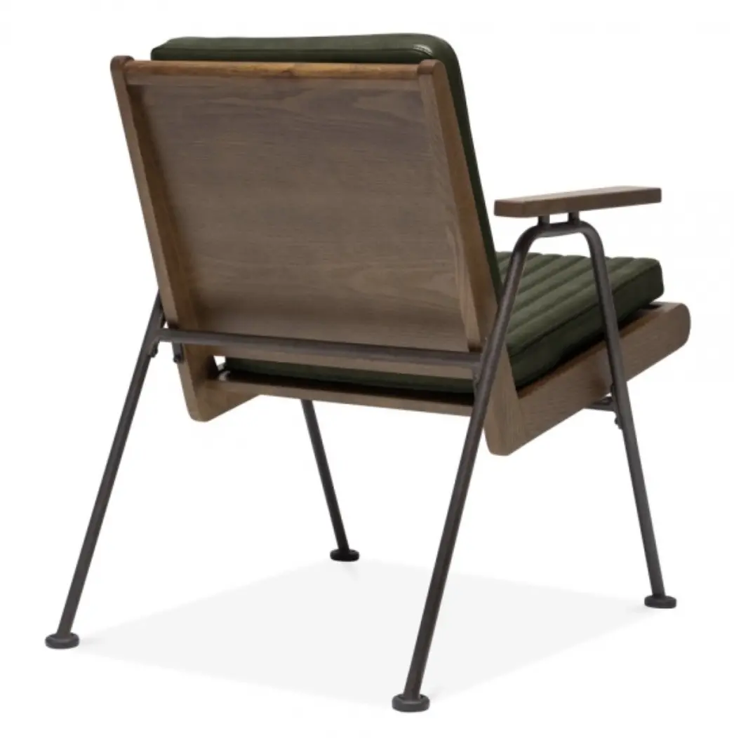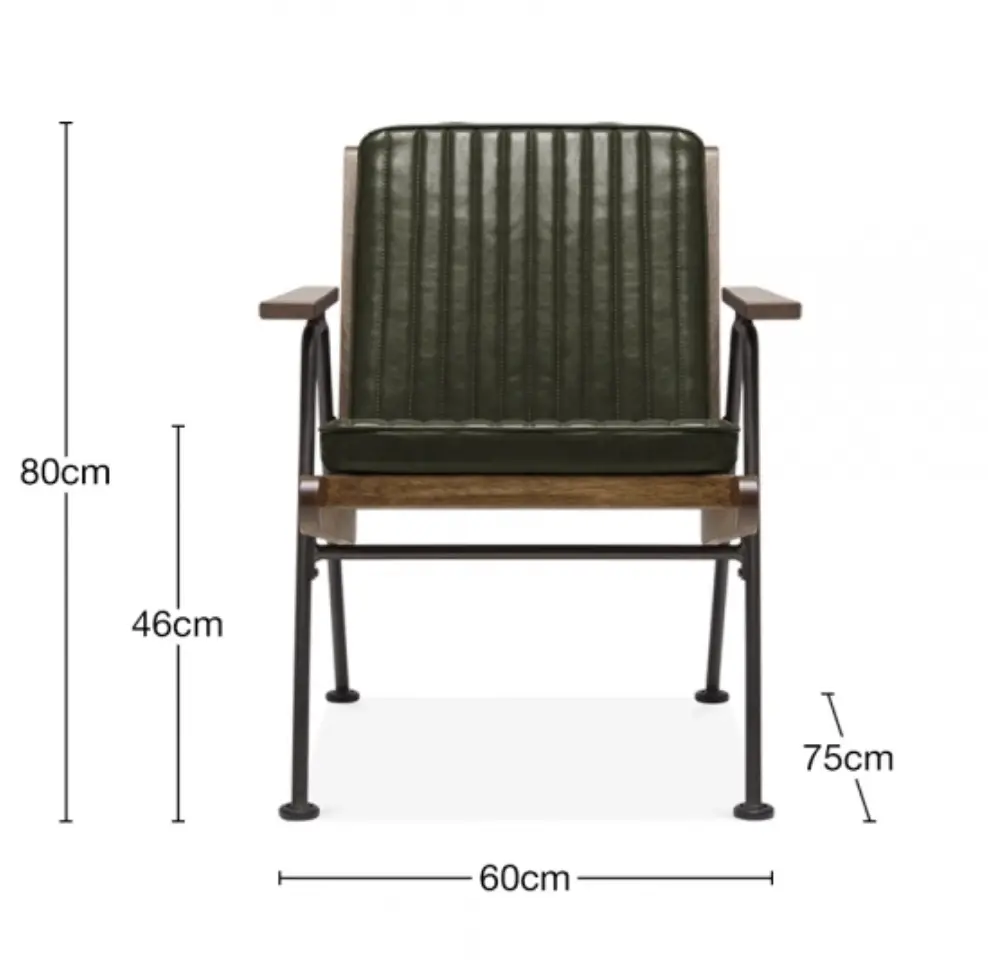 Introducing the industrial Wickham accent chair in green faux leather, wood and metal – all ready to bring a designer look to your living room furniture, office, meeting area and more.